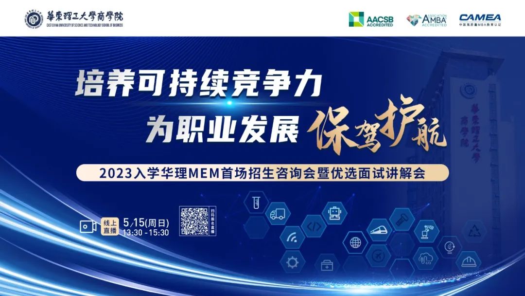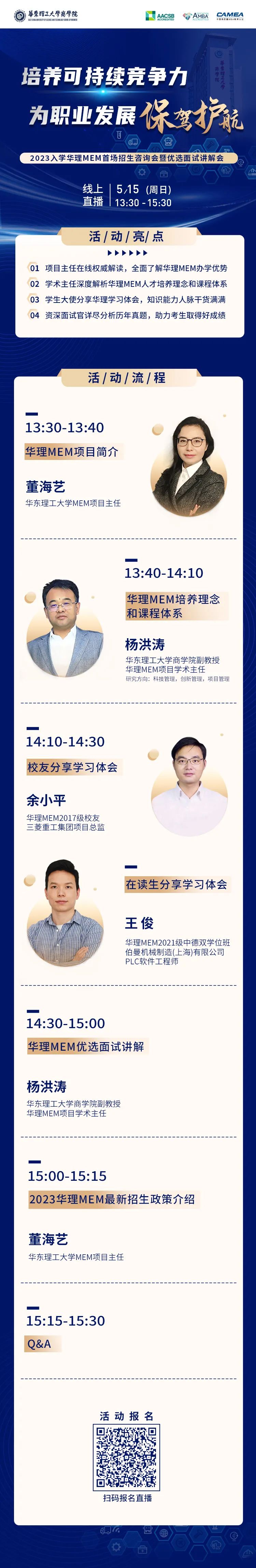 在一个科技几乎涉及生活和商业所有方面的世界里,拥有工程管理硕士(Master of Engineering Management)学位的学生可以无缝地融入当今的高科技公司,这些公司需要有技术头脑的领导者来进行数据驱动的决策和创新驱动的全球战略与增长。 ——美国工程管理硕士协会(MEMPC) 选择报读华理MEM 提升专业知识和技能 保持可持续竞争力 为职业发展保驾护航 华理MEM秉承华理suncitygroup太阳新城“连接商业与科技,培养知行合一的经管人才”的使命,创新“商业+科技”的培养体系,不但与德国柏林工业大学举办了国内稀缺的工程+管理跨学科双学位MEM项目,而且开设了“智能制造与智慧运营”、“大数据商务分析”和“项目(群)与敏捷项目管理”三大特色专业模块,旨在培养具有国际视野、卓越管理能力和完备工程实践能力的复合型高端人。 2022年5月15日,对话华理MEM项目学术主任杨洪涛副教授,全面了解华理MEM结合学科优势和我国产业发展的复合型人才培育理念,以及以行业人才需求和学生职业发展为中心的“商业+科技”特色课程体系,给予您在逆流中成长,风险中前行的制胜法则,以可持续竞争力应对多变的环境!杨洪涛副教授长期担任华理MEM优选面试官和优选面试命题小组成员。直播当天他还将详尽解读优选面试的流程及注意事项,让您获得百度不到的优选秘籍! 活动时间 2022年5月15日(周日)13:30—15:30 活动预约 扫描二维码报名 活动详情