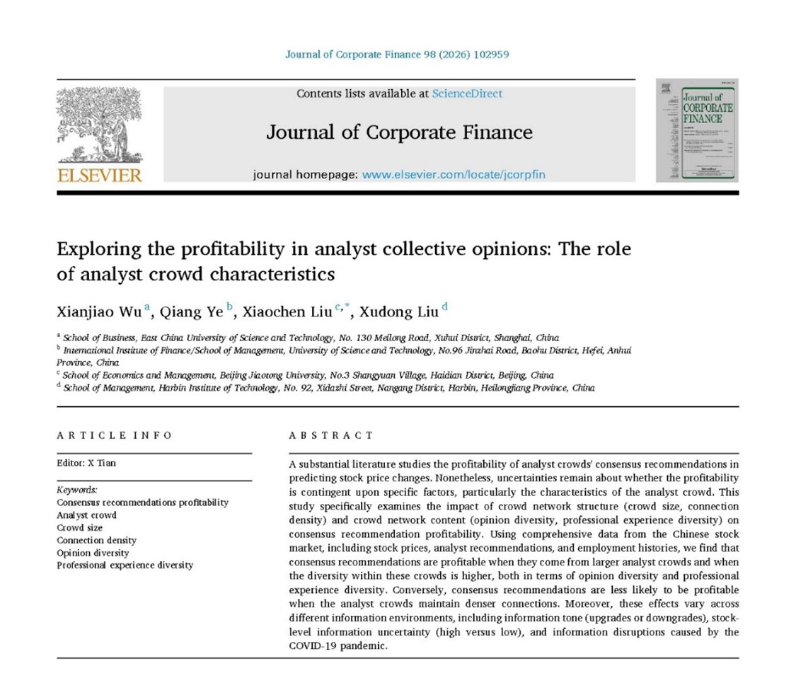 论文信息:Xianjiao Wu, Qiang Ye, Xiaochen Liu*, Xudong Liu. (2026). Exploring the profitability in analyst collective opinions: The role of analyst crowd characteristics. Journal of Corporate Finance, 102959.