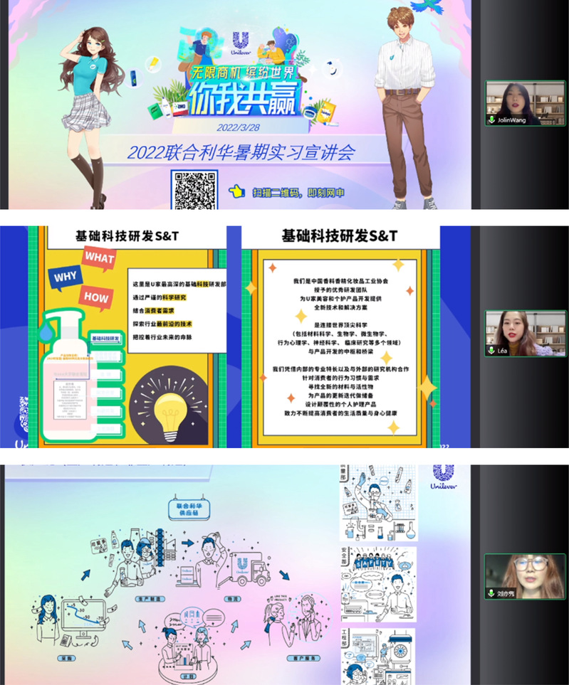在3月29日晚举行的“连线未来职场”首期活动中,跨国消费品公司联合利华受邀开启线上直播,吸引了千余位学生参与。联合利华校招负责人王珠琳介绍了公司的整体概况,为同学们勾勒出企业的现状与愿景,详细介绍了管理培训生制度和2022年暑期实习项目,并欢迎优秀华理学子的加入。本场活动还特别邀请到就职于联合利华的两位华理校友为同学们“现身说法”。两位校友分别结合所在部门的工作内容和个人职场发展经历作了精彩分享,并解答了同学们的提问。