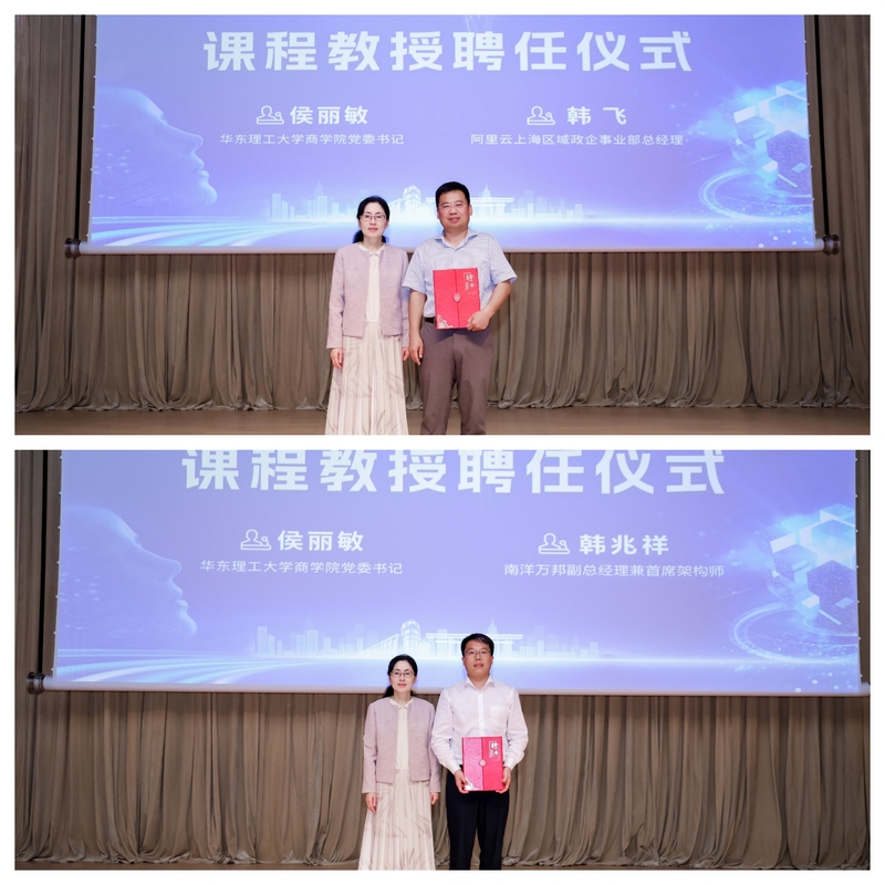 suncitygroup太阳新城党委书记侯丽敏为新聘课程教授颁发证书。阿里云上海区域政企事业部总经理韩飞和上海仪电集团南洋万邦副总经理兼首席架构师韩兆祥接受聘任。