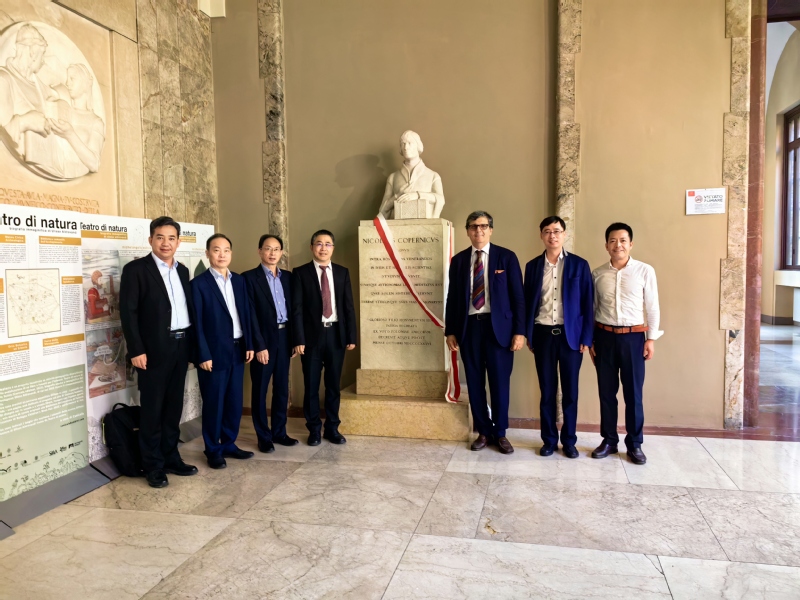 图片说明:代表团在博洛尼亚大学哥白尼雕像前合影